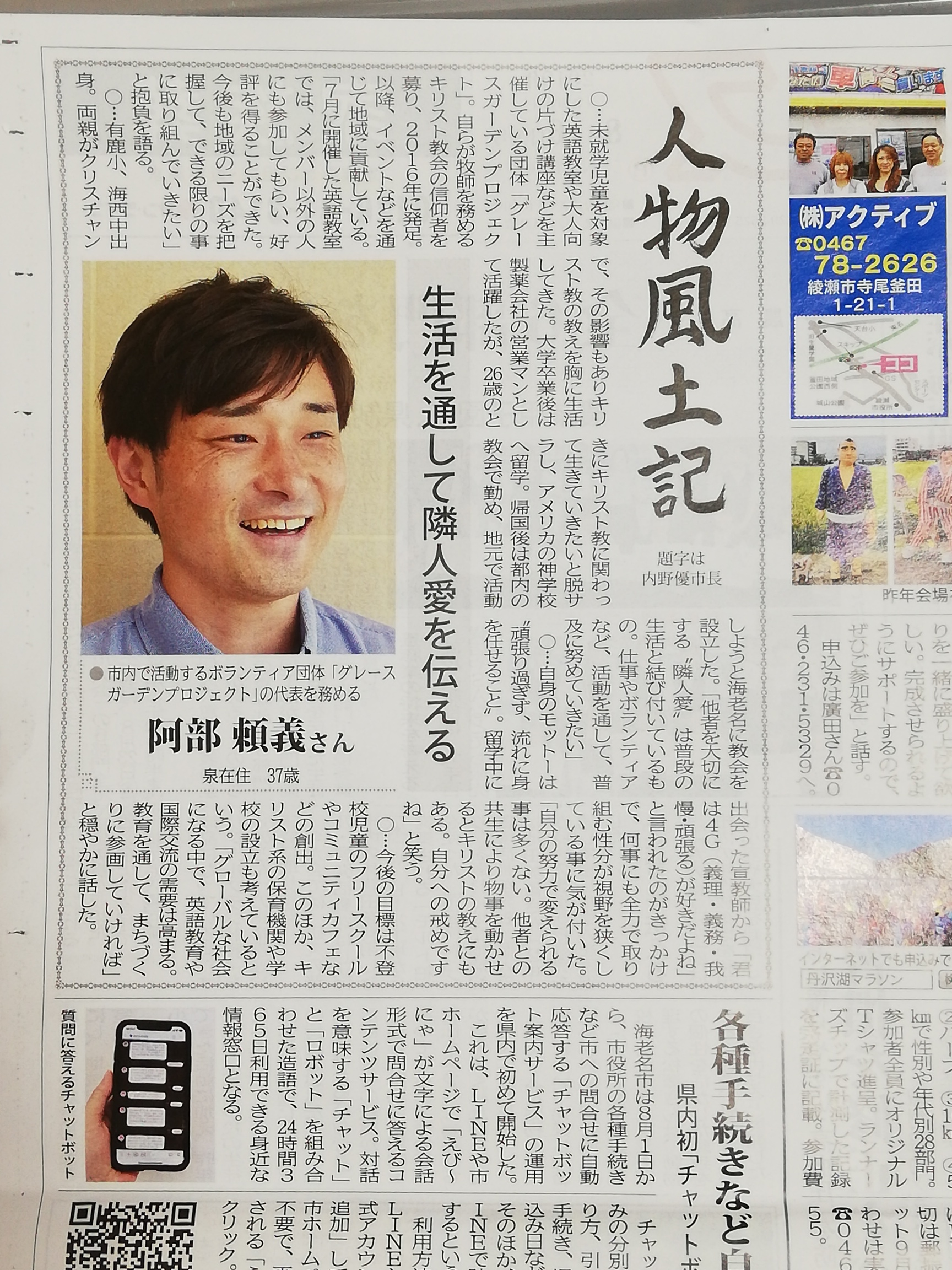 教会の活動 タウンニュースの人物風土記に掲載していただきました! 投稿者: Grace Garden Church 投稿日: 2019年8月17日2021年9月1日 https://www.townnews.co.jp/0402/2019/08/16/493633.html 教会のプロジェクト「Grace Garden Project」の活動をタウンニュースの人物風土記に掲載していただきました! 共有: クリックして X で共有 (新しいウィンドウで開きます) X Facebook で共有するにはクリックしてください (新しいウィンドウで開きます) Facebook いいね 読み込み中…